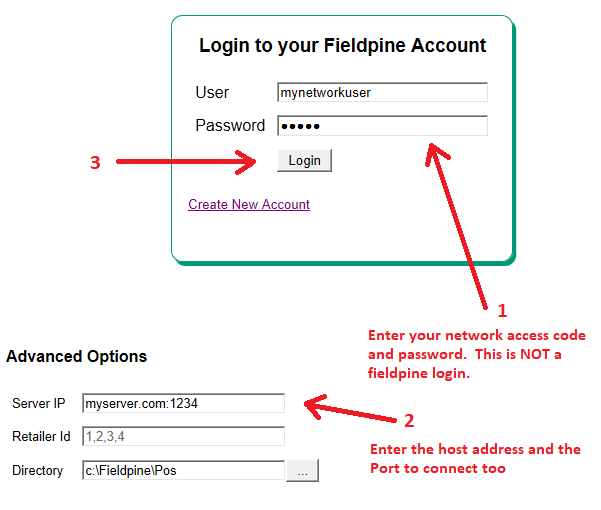 If your Pos system is to use Fieldpine Online as the primary database, then enter your Fieldpine login details and click login.