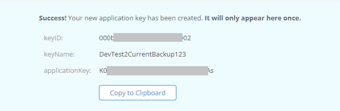 When the application key is created, the following screen will be displayed. This is shown only once, so make sure you capture these details. if you lose them, simply delete the application key and create another one.